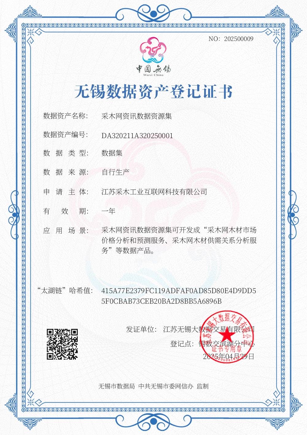 “采木网资讯数据资源集”由江苏采木工业互联网科技有限公司自建平台所产生的网价、供求、招标、销售、解锁记录等信息形成,利用大数据技术,通过数据的有效融合,提炼出木材价格动态、成交情况等核心信息,为优化供应链、推动数据资产化、提高行业信息透明度和木材行业的可持续发展做出了贡献,实现社会价值。