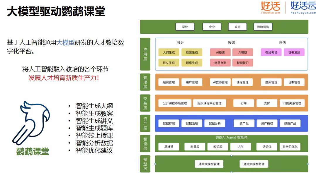 鹦鹉AI课堂平台结合人工智能技术建设的鹦鹉AI课堂与好活集团在数据要素方面的深度实践与研究,提出该方案以推进高校数智化转型极,鹦鹉AI课堂平台通过线上化课程管理的方式,构建学生学习···